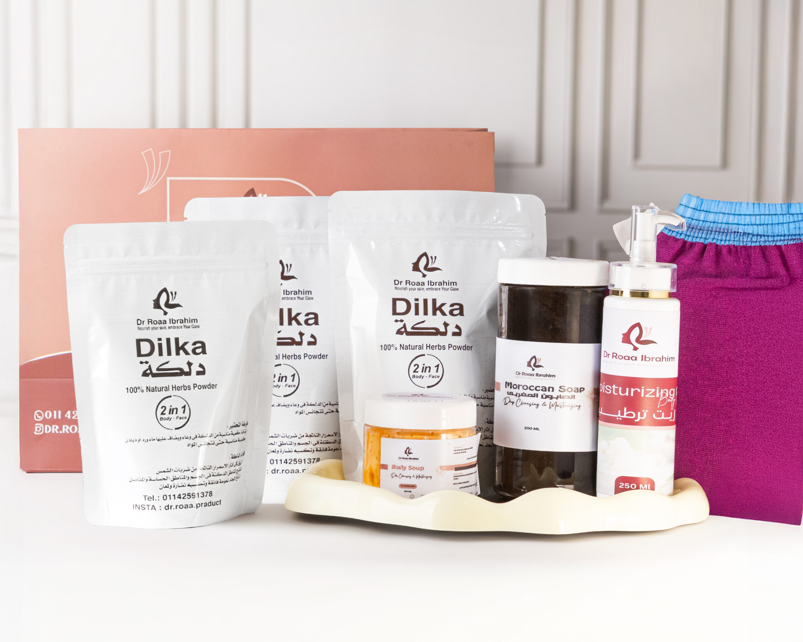 - ٣ أكياس من الدلكة السودانية: لتقشير البشرة بلطف، تفتيح وتوحيد اللون، ومنح نعومة فائقة ونضارة طبيعية مع الاستمرار.