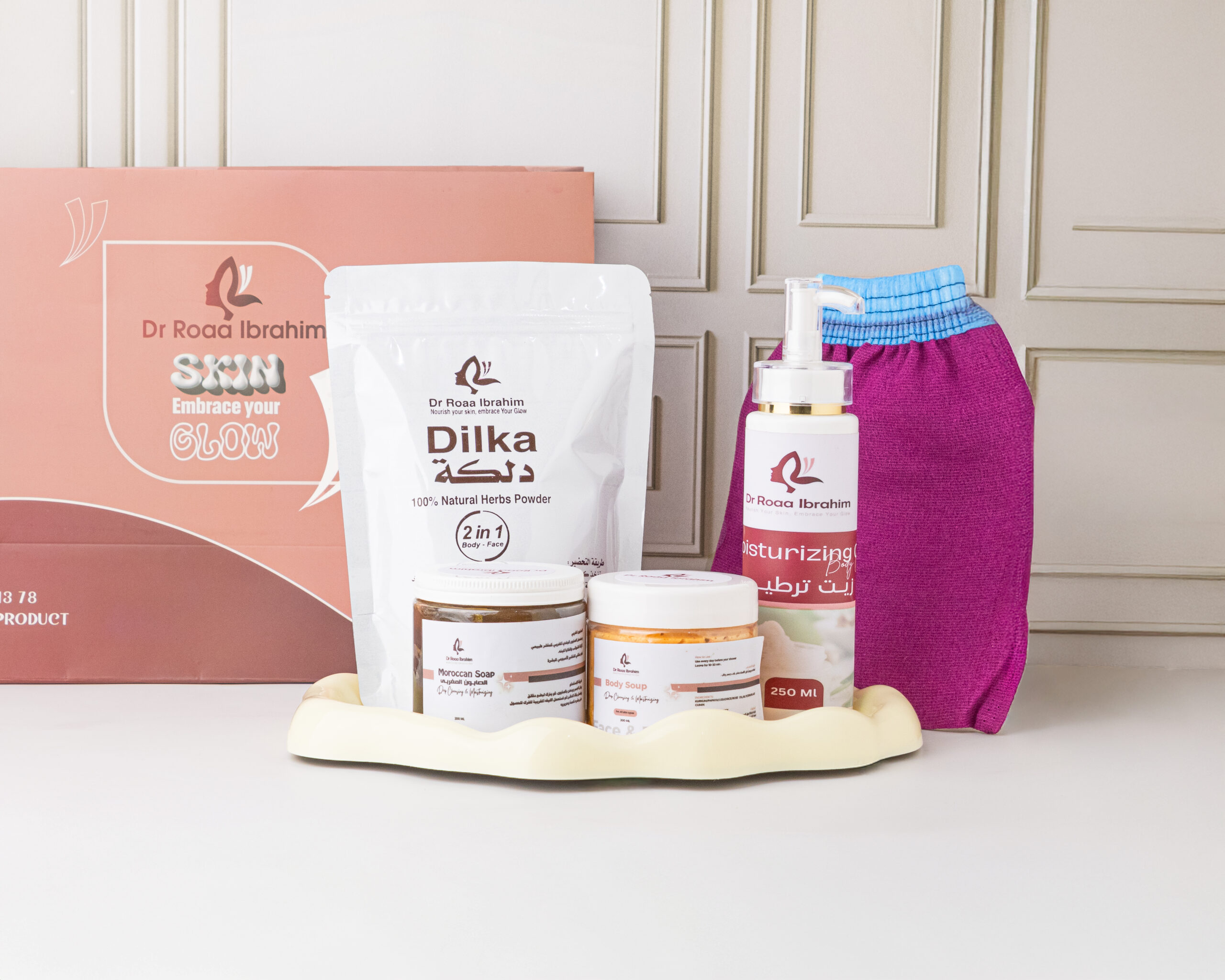 بكج متكامل يضم الدلكة، الصابون المغربي، الليفة، صابونية الجسم، زيت الترطيب وأكياس الجسم. مصمّم لتنظيف وتقشير وترطيب البشرة بعمق، وتوحيد لونها ومنحها نعومة ونضارة مثالية للمناسبات الصغيرة